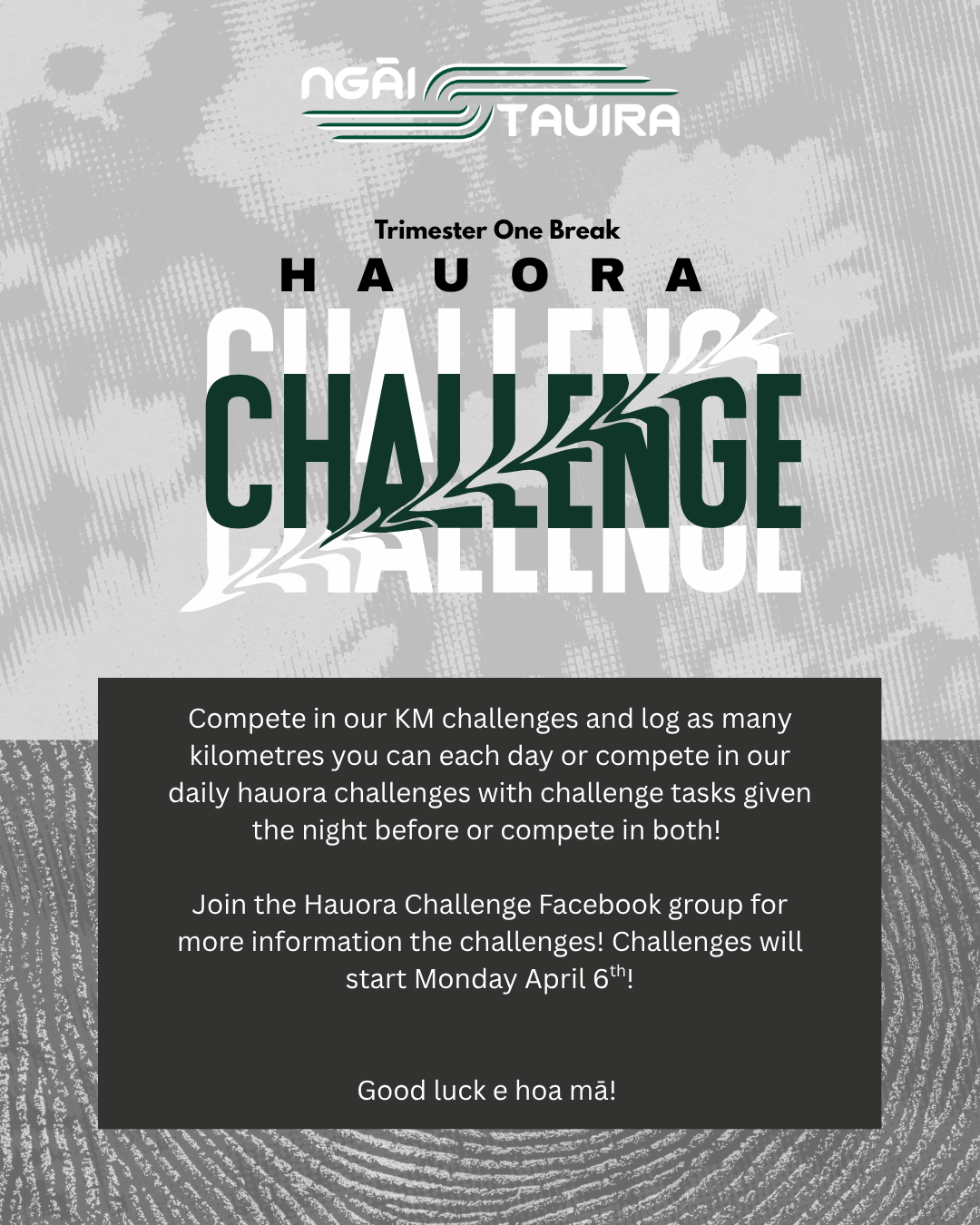 Every mid-Trimester break our Āpiha Hauora runs the Hauora Challenges, this kaupapa is designed to encourage tauira to look after their hauora and stay connected to other tauira throughout the breaks.